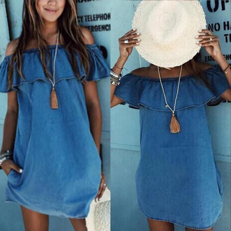 Deals VISNXGI Women Casual Denim Dresses Loose Off Shoulder Jeans Dresses Summer Casual Sleeveless Ladies